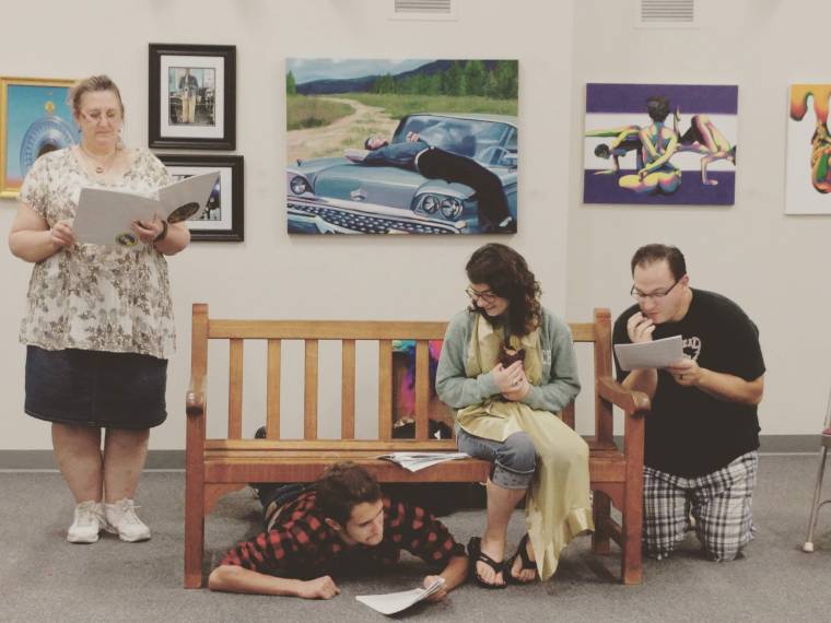 Jillian Landolina, on bench, rehearses with the cast of Myth Project 3.